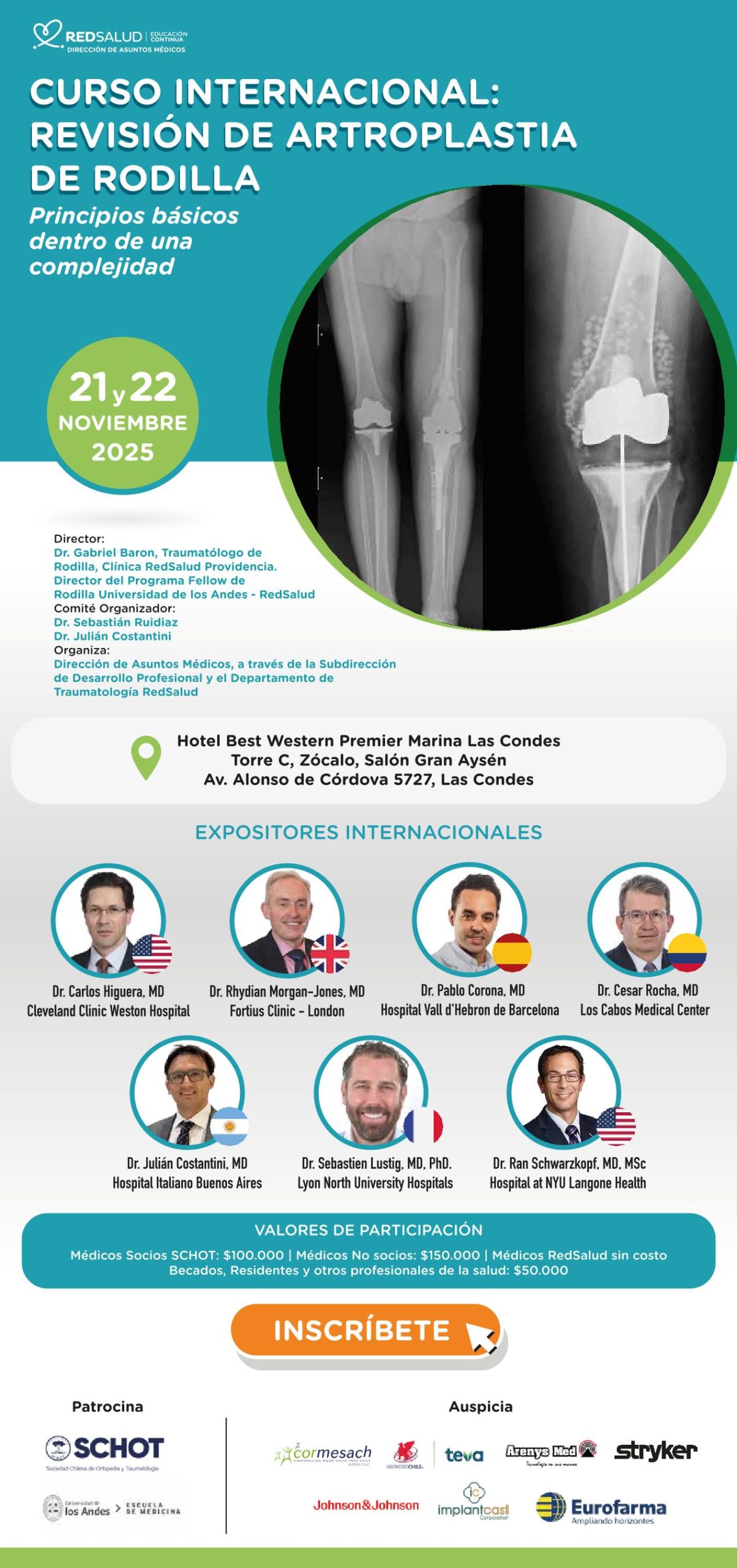 Este curso estará enfocado en comprender las causas de fracaso en la artroplastia de rodilla, su diagnóstico, tratamiento y la prevención de complicaciones. Contaremos con la participación de destacados especialistas nacionales e internacionales, quienes compartirán su experiencia y conocimientos.